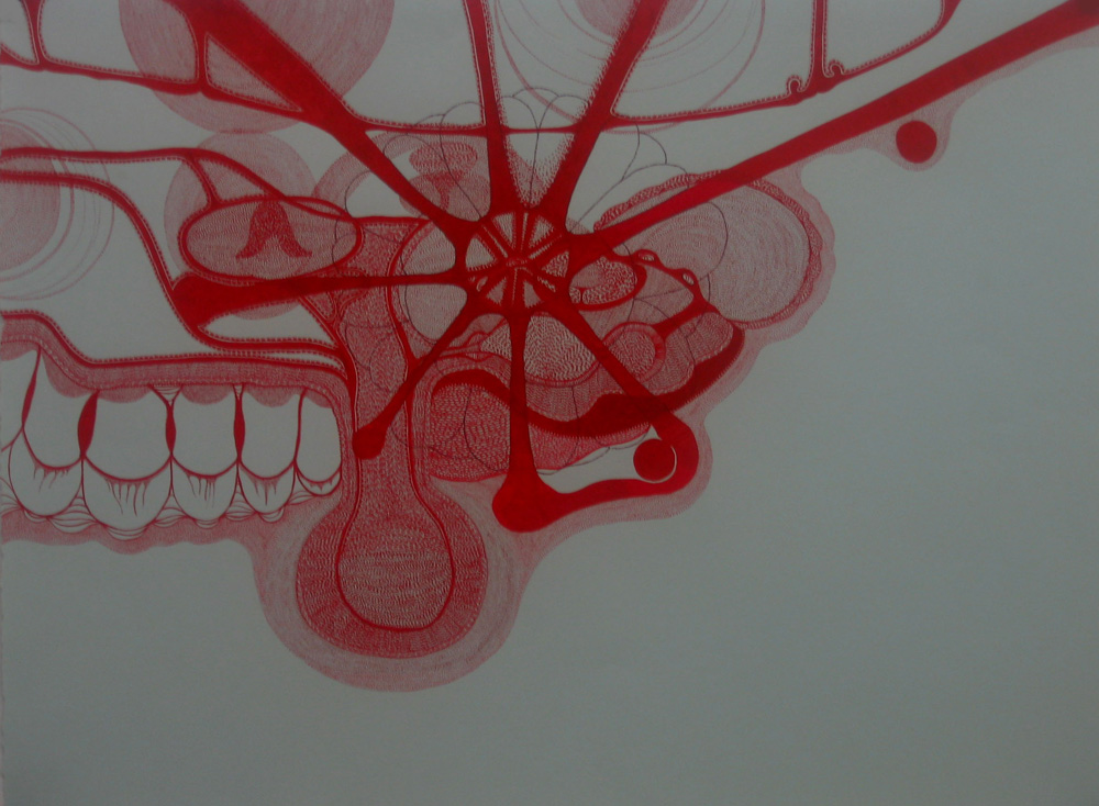 Red ink on pale blue paper