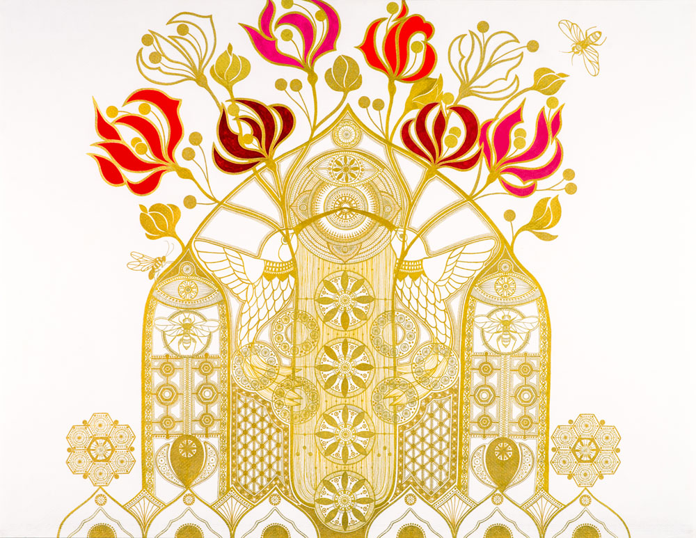 Gold metallic ink and gouache on paper