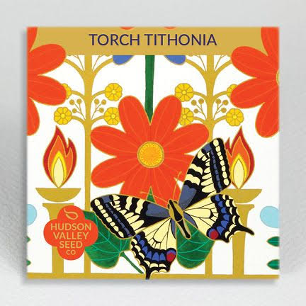 This image was created for Hudson Valley Seeds' 'Art Pack' series. Each year, HVS commissions a group of artists to design the packaging for their seed packets. My seed inspiration was Torch Tithonia, or Mexican Sunflower. The piece incorporates some 'torches', as well as a Swallowtail Butterfly, one of the many pollinators that this beautiful bloom attracts.View Available Work